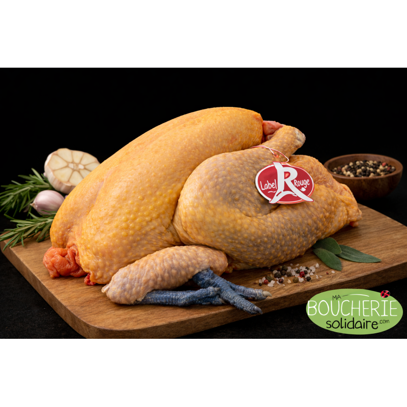 Chapon fermier Label Rouge Pattes Bleues, élevé en plein air selon un cahier des charges exigeant. Abattage halal certifié AVS. Origine France. Chair fondante et savoureuse, idéale pour les repas festifs. Livraison ChronoFresh.